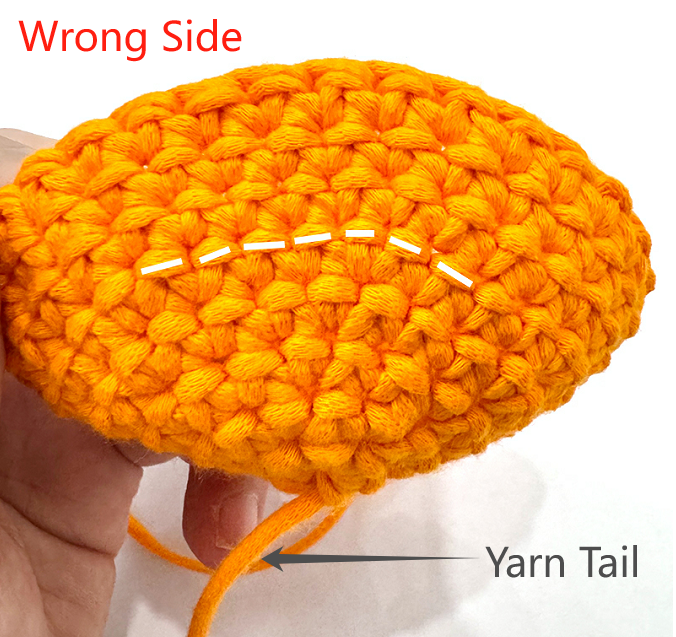On the wrong side of the crochet piece, there is a yarn tail and there are many horizontal lines.