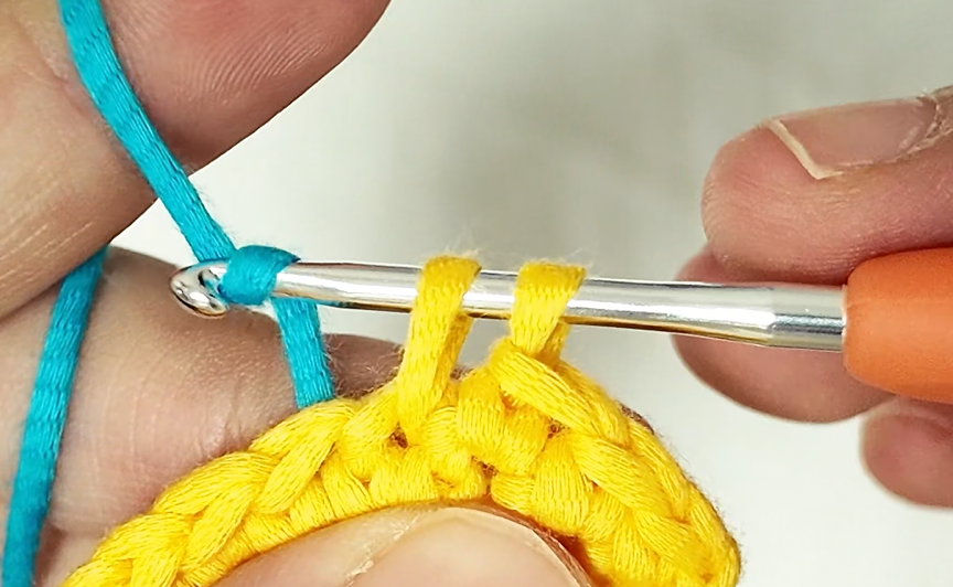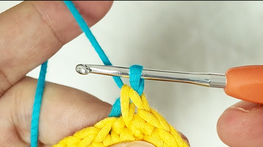 Yarn around the hook with the new color(blue).