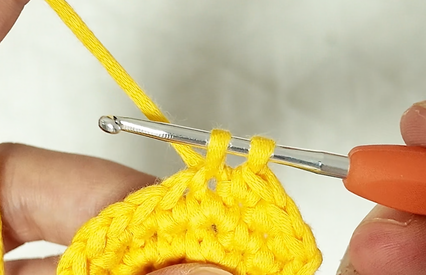First crochet to the penultimate step of color 1(yellow).