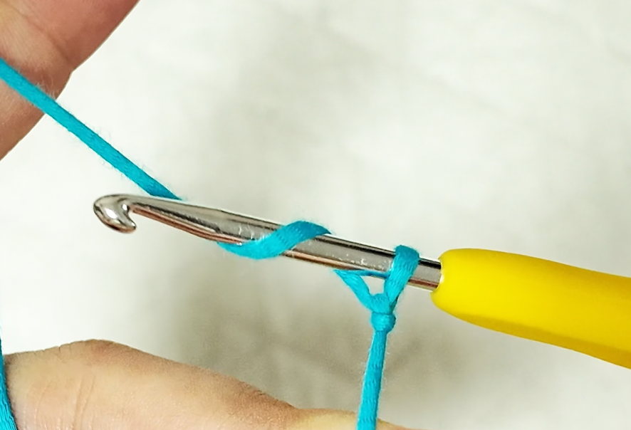 2.Yarn wrap around the hook and bring the yarn through the loop on the hook.
